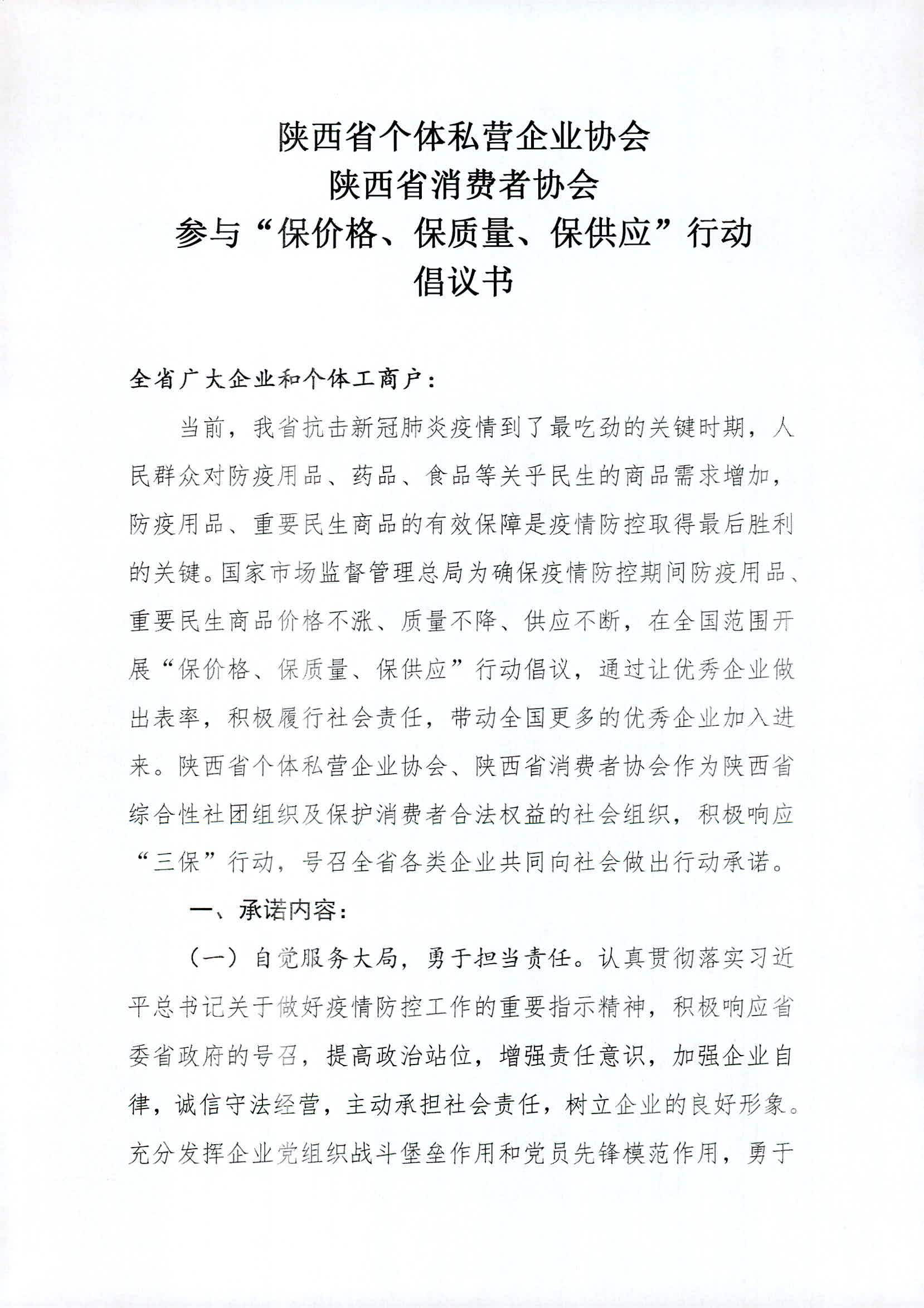 陕西省个体私营企业协会 陕西省消费者协会 参与“保价格、保质量、保供应”行动倡议书 | | 发布时间:2020-02-21 00:00:00 扫一扫在手机打开当前页 【打印正文】 【复制链接】 分享让更多人看到 推荐文章