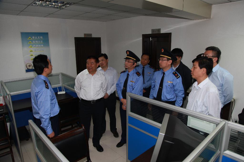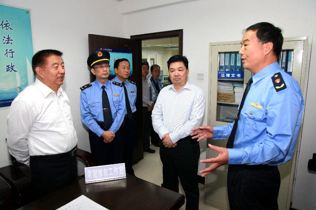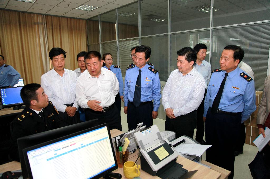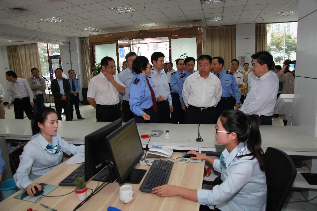 首发仪式结束后,刘玉亭局长一行来到宝鸡市工商局渭滨分局调研指导工作。在该局经二路工商所,刘局长视察了办事大厅、巡查监管中队、档案室、老谢维权工作室,详细询问了多位基层同志在监管执法、消保维权方面的工作情况,亲切交流了存在问题,用“功能齐全,管理规范”给予该所充分肯定。随后,在渭滨分局机关,听取了王建强局长的工作情况汇报,观看了渭滨区集贸市场数字化监管平台,并对渭滨分局的各项工作给予高度评价。刘玉亭副局长指出,渭滨分局干部精气神足,精神面貌好,各项管理工作到位,在服务区域经济发展、消费维权和执法监管方面做了大量富有成效的工作。关于今后工作,刘玉亭副局长指出,各级工商部门要适应新的形势和任务要求,牢固树立依靠地方党委政府的意识,积极主动作为的意识和创新思维意识,在新的历史时期,谋求工商行政管理工作新的更大发展。