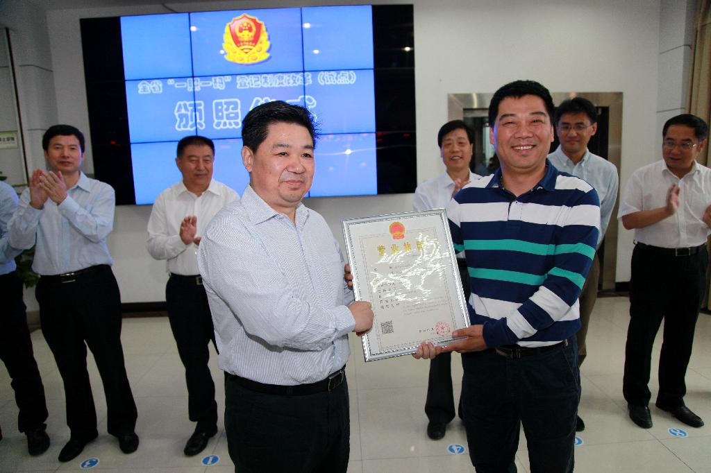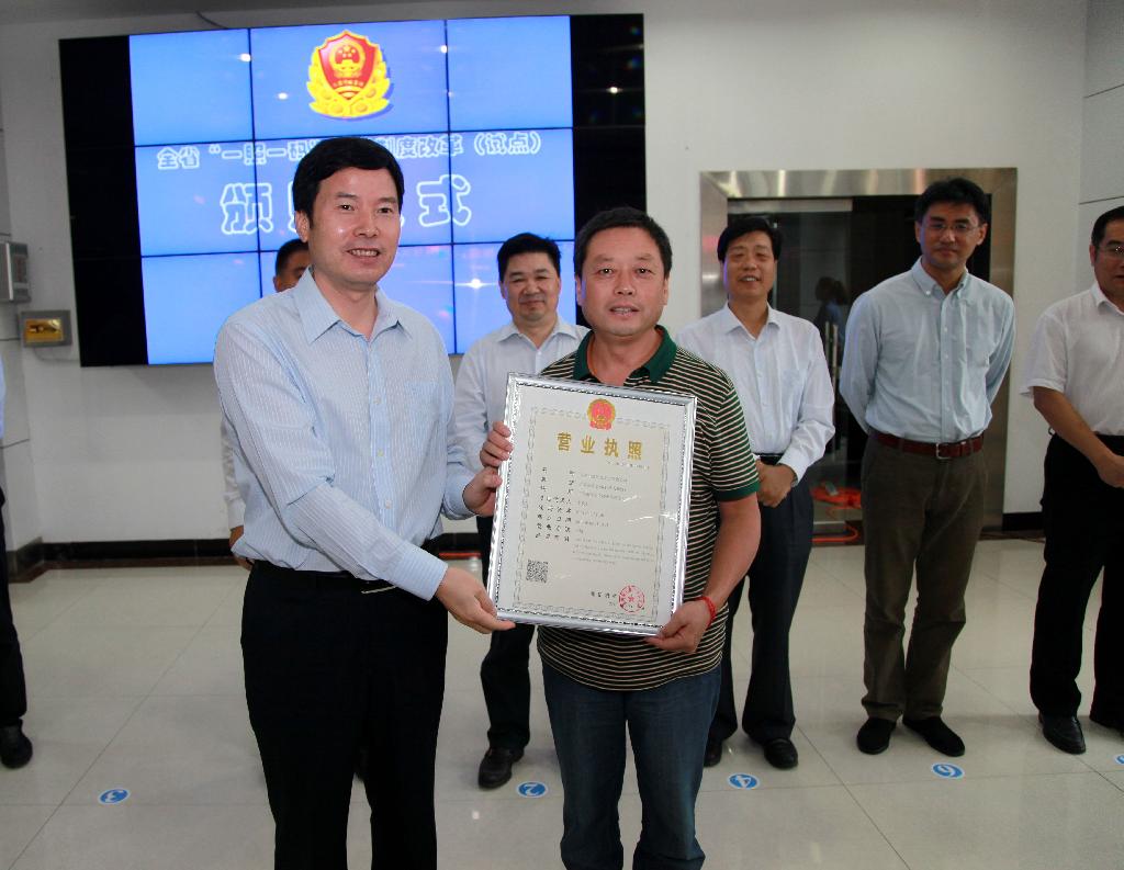 省局王吉德局长为企业颁发“一证一码”营业执照