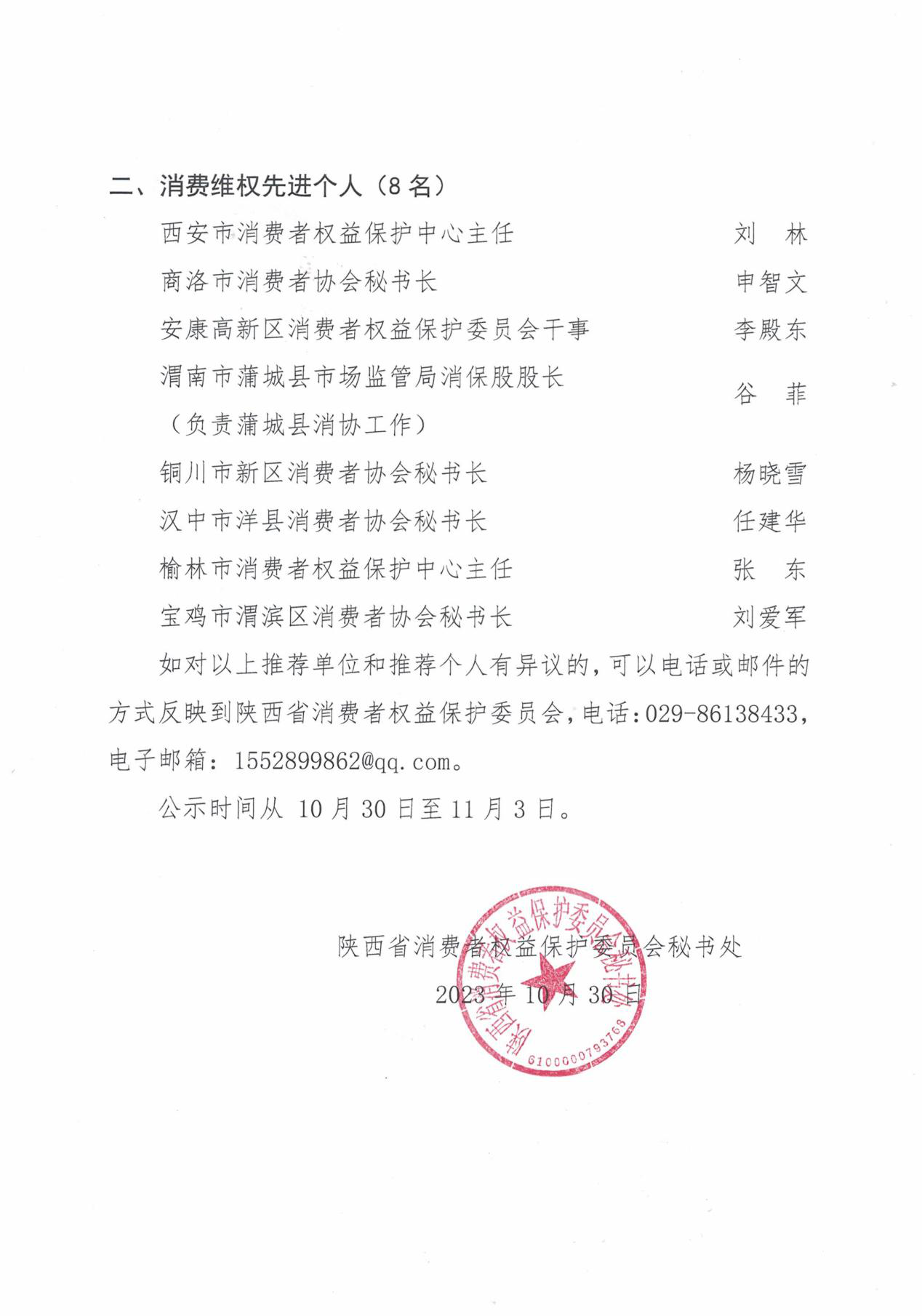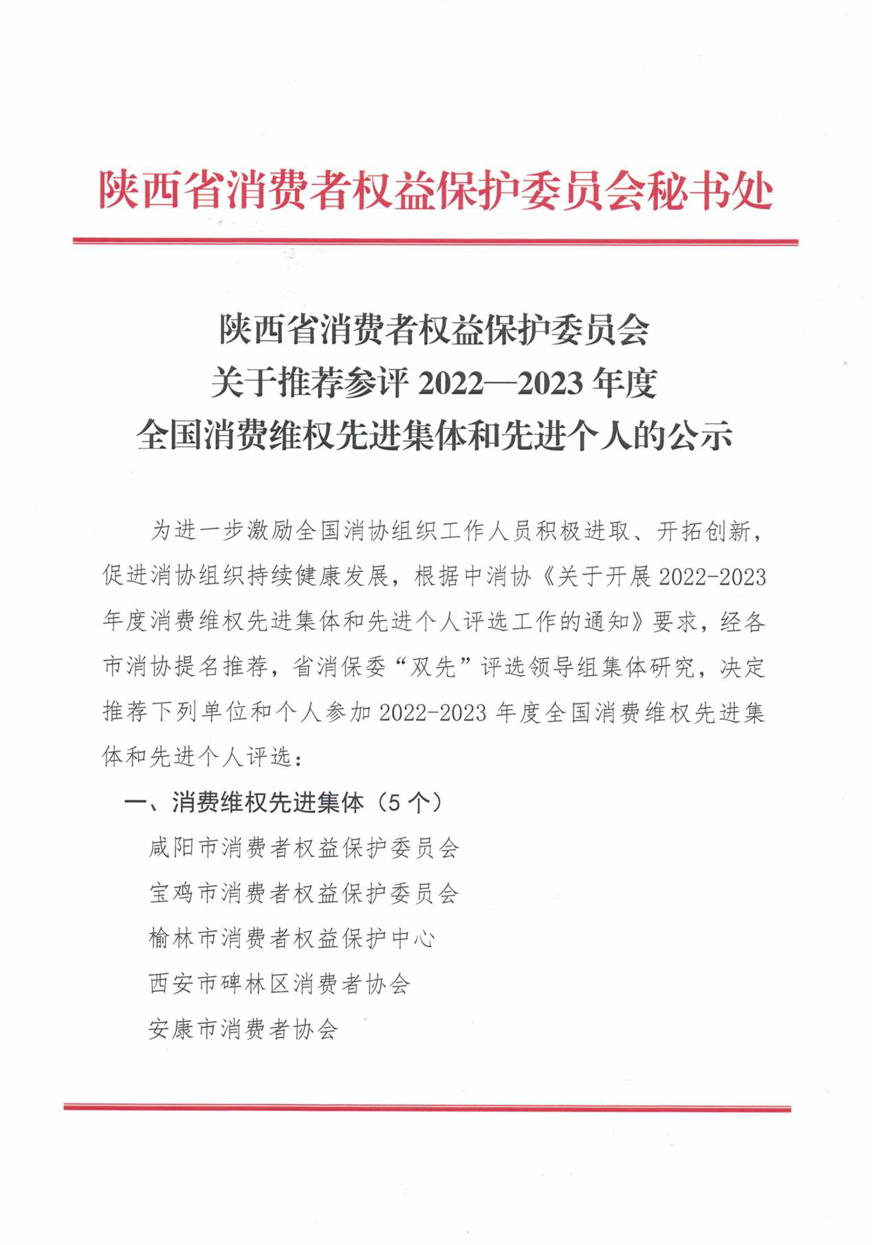 陕西省消费者权益保护委员会关于推荐参评2022——2023年度全国消费维权先进集体和先进个人的公示 | | 发布时间:2023-10-30 17:07:04 扫一扫在手机打开当前页 【打印正文】 【复制链接】 分享让更多人看到 推荐文章