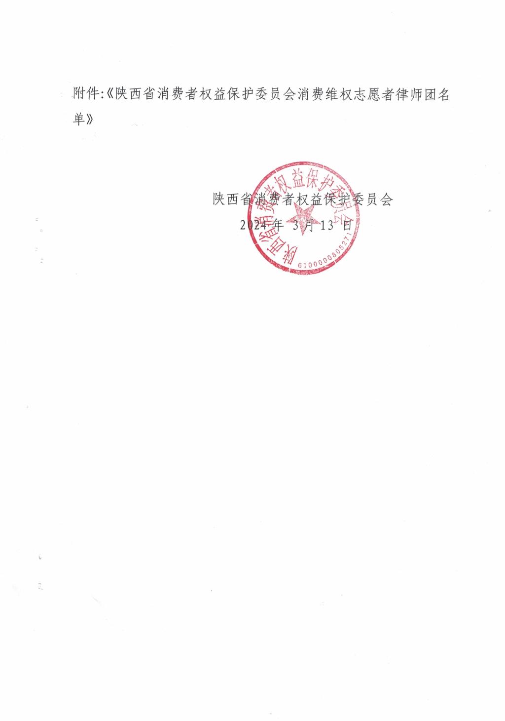 为贯彻落实《中华人民共和国消费者权益保护法》和《陕西省消费者权益保护条例》赋予消费者组织的职责,充分发挥律师在消保维权社会监督工作中的作用,陕西省消费者权益保护委员会(以下简称省“消保委”)决定成立省消保委消费维权志愿者律师团(以下简称“律师团”),聘任屈金冈同志为律师团团长,王娜等19名同志(名单见附件)为律师团首批消费维权志愿者律师。聘期5年(2024年3月15日至2029年3月15日)。