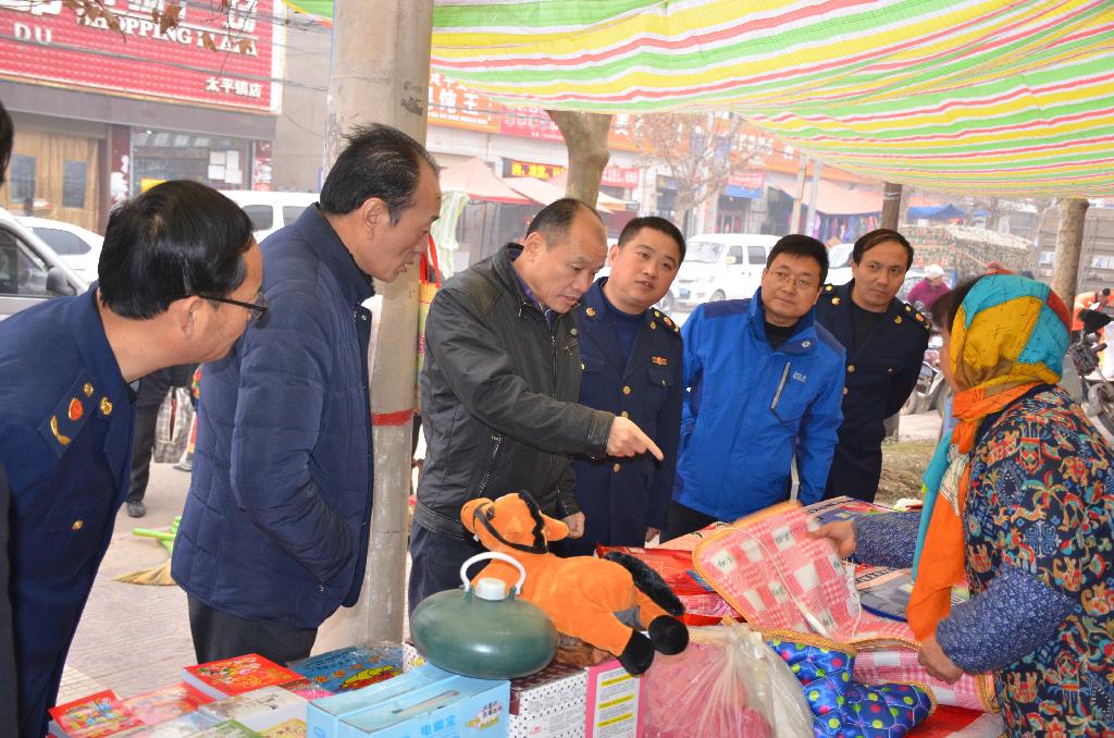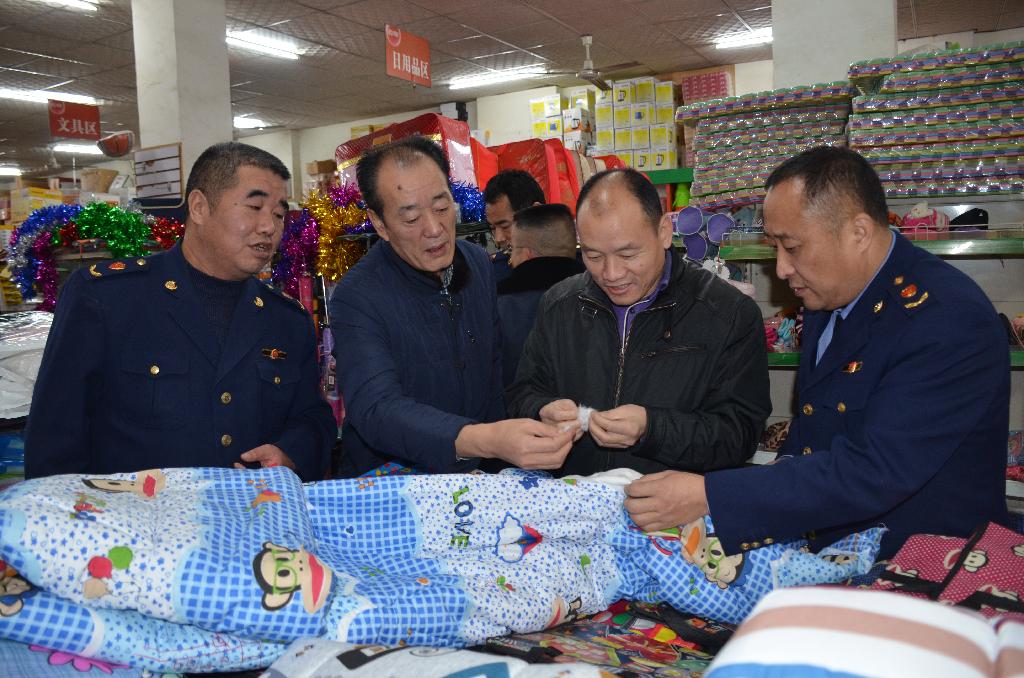 12月22日至24日,区局刘育民副局长带领市场消保处同志利用3天时间深入到五个新城分局辖区,对节前市场整治工作进行现场督导检查。刘局长一行带领基层执法人员进商场、进超市、进杂货铺、进集贸市场,逐门逐店对商品的进货渠道、标识标牌、商品质量、经营者主体资格、商标广告及市场内销售生鲜肉的三章两证进行了认真细致的检查,对检查中发现的“三无”产品和不合格产品要求立即下架,并要求各新城分局要通过宣传教育、行政约谈、立案查处等手段,多管齐下,切实维护市场良好秩序。此次现场检查,共下架涉嫌不合格电暖气、暖手宝、插座72件,查扣涉嫌仿冒注册商标电热毯33件,查扣“三无”服装黑心棉大衣、棉被等商品161件,此举有效的净化了市场环境。
