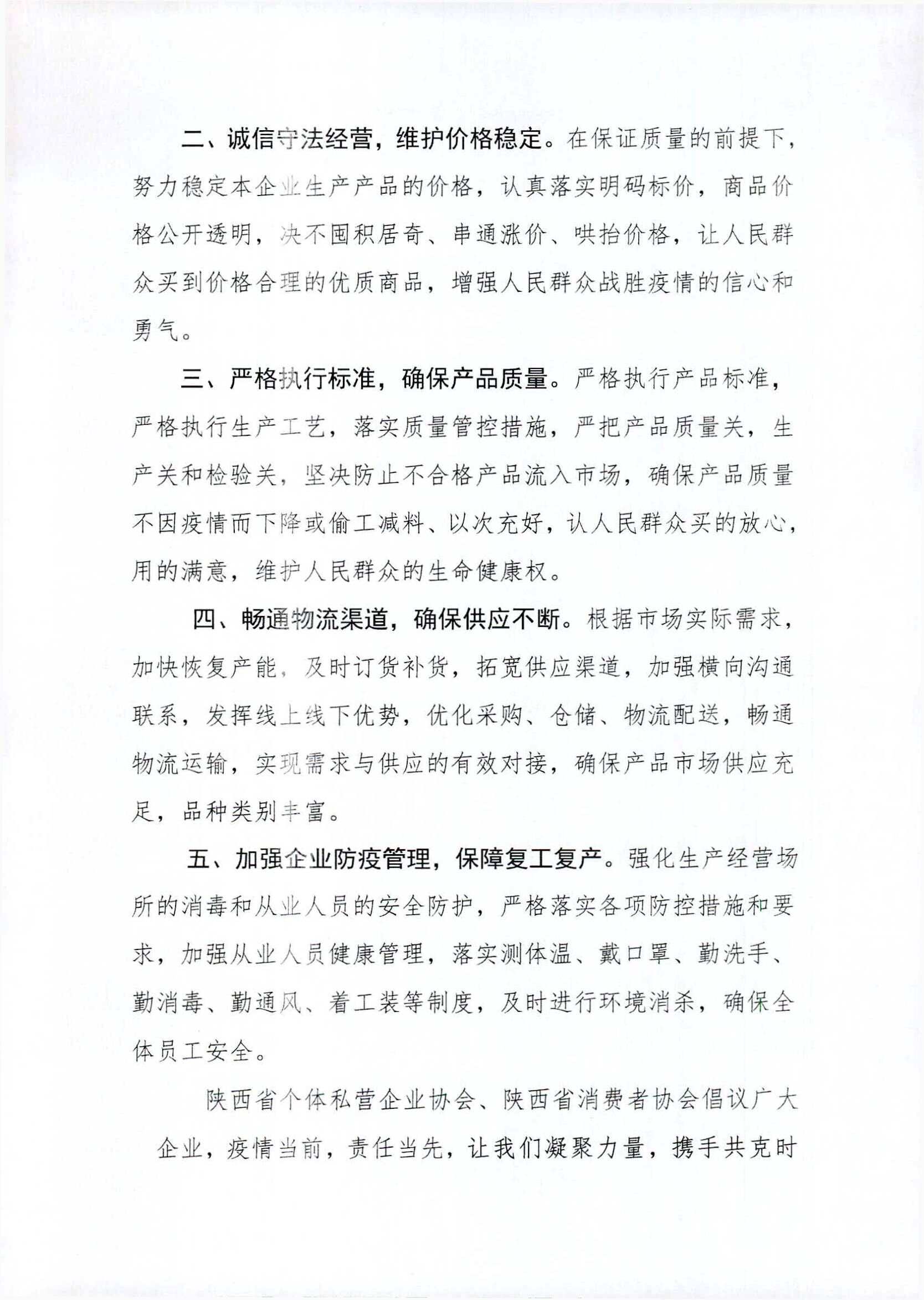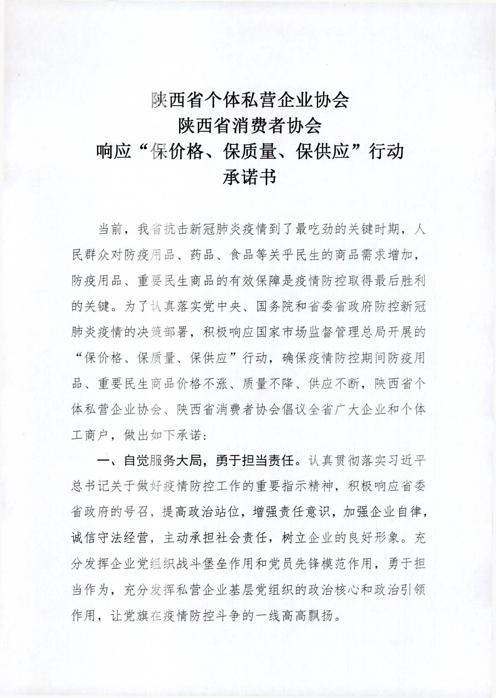 陕西省个体私营企业协会 陕西省消费者协会 响应“保价格、保质量、保供应”行动承诺书 | | 发布时间:2020-02-21 00:00:00 扫一扫在手机打开当前页 【打印正文】 【复制链接】 分享让更多人看到 推荐文章