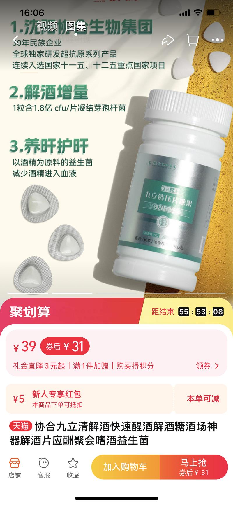 “九立清压片糖果”的产品,视频广告称“吃上二粒 酒场不惧”,图片广告称“酒前服用:增酒量 防酒醉;酒后服用:助解酒 止头痛”“酒前两粒 来者不拒”“解酒增量 养旰护旰”。该产品生产厂家为巨余(长兴)生物技术有限公司,厂址在浙江省湖州市。