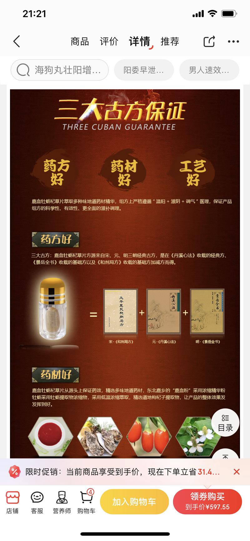 鹿血牡蛎杞草片宣称“三大古方保证 药方好 药材好 工艺好 滋养补“。