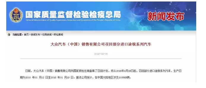 日前,大众汽车(中国)销售有限公司向国家质检总局备案了召回计划,将从2016年4月18日起,召回部分进口途锐系列汽车,生产日期为2010年01月12日至2016年01月19日。据该公司统计,在中国大陆地区涉及103569辆。