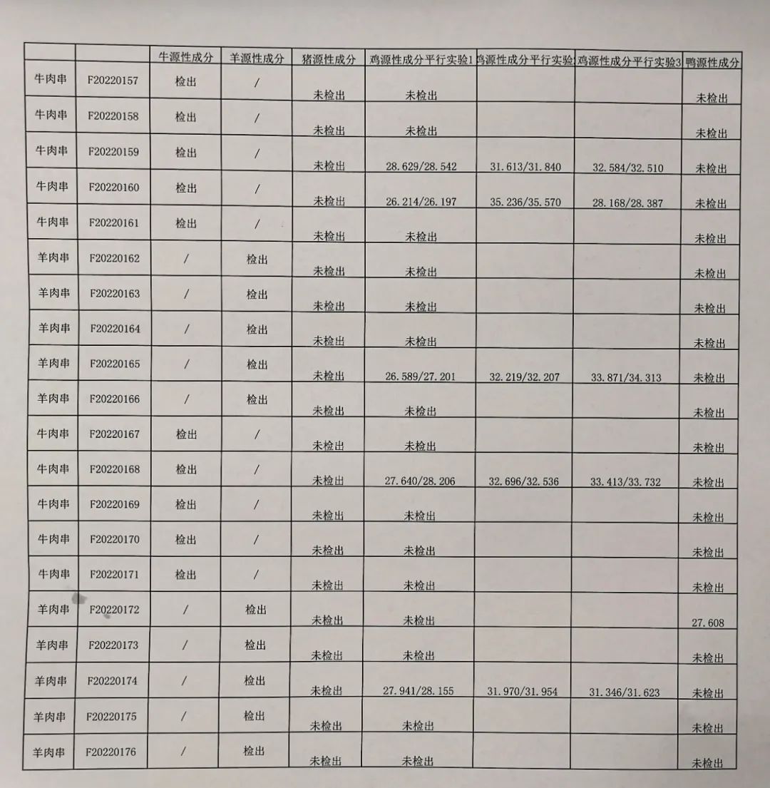 检测人员对取样批次的牛、羊肉串是否含有鸡肉、鸭肉以及猪肉成分进行了检测。检测结果显示,其中3批次牛肉串检出鸡肉成分,2批次羊肉串检出鸡肉成分。