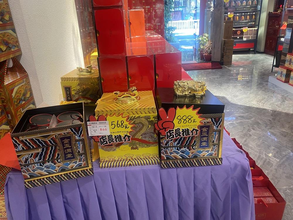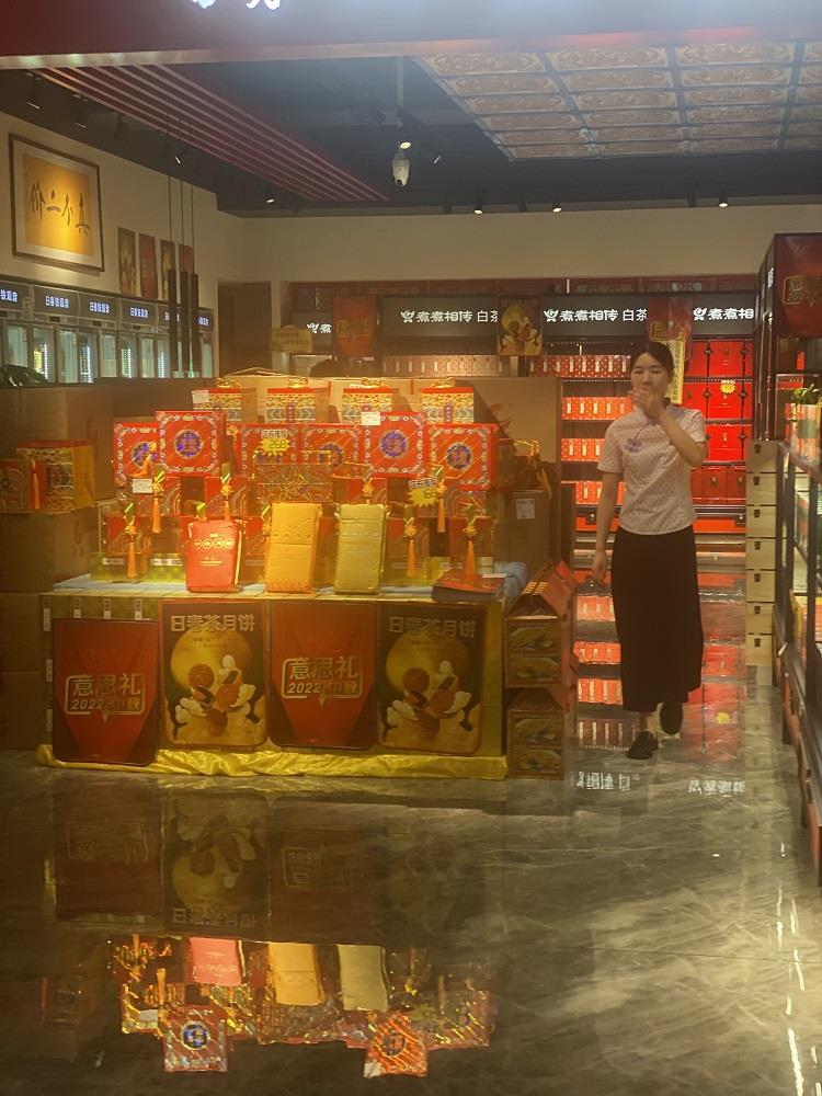 随后,记者走访日春茶业福飞店、湖东店、华林店3家门店,展示台上均未见到金玉满堂和大富大贵包装箱,也未见包装成条状的“888、568”中秋月饼。在记者的提示下,店员才拿出了金玉满堂、大富大贵包装箱以及“888、568”中秋月饼供记者选购。