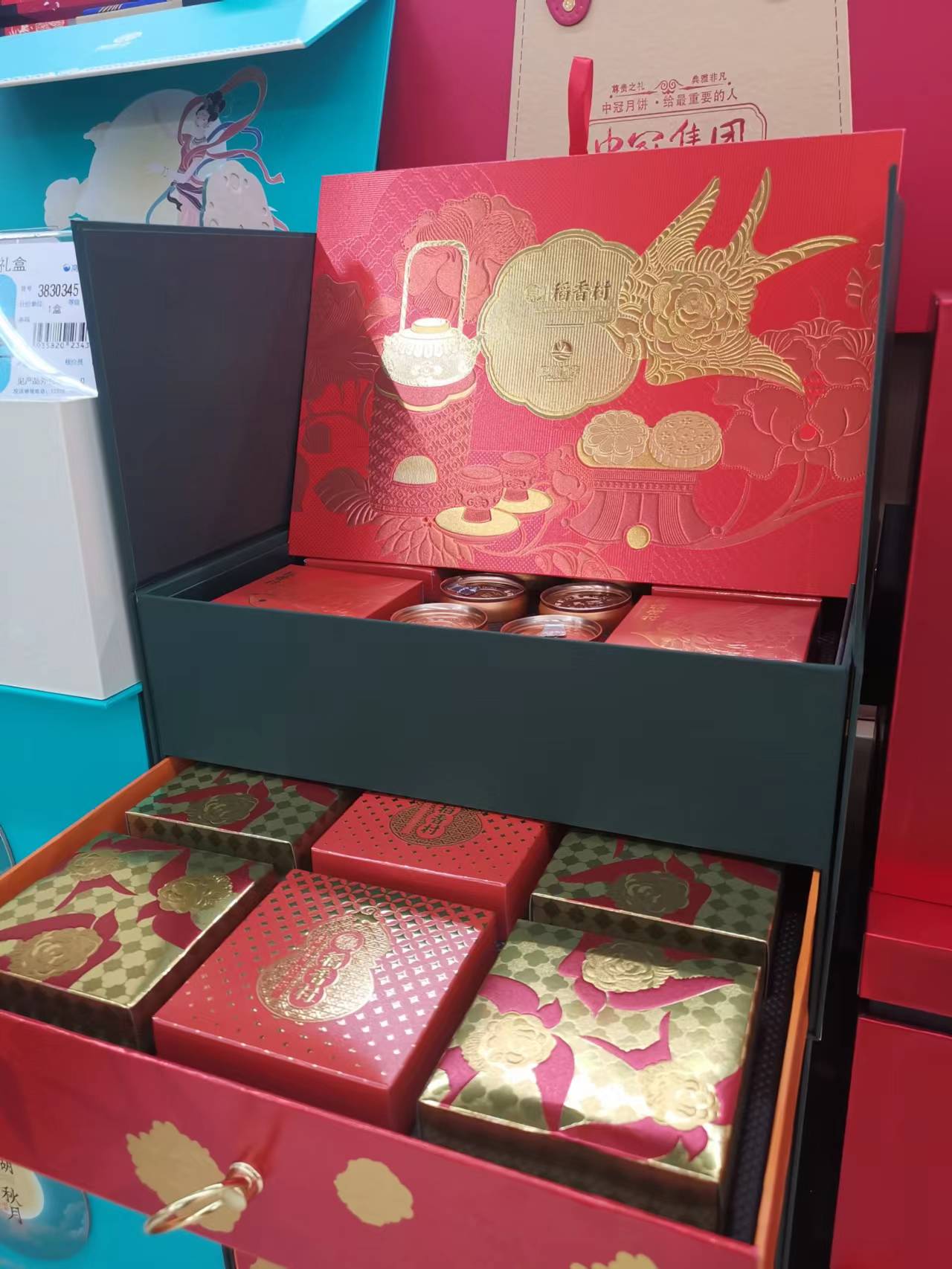 记者在调查中也见到了铁皮、皮质等包装的月饼礼盒,包装层数超过了3层,个别厂家还混装了茶叶。例如,记者在大润发金牛店看到,“重庆冠生园食品二厂成都联合分厂”的一款名为“玛丽斯汀”月饼礼盒,拥有手提箱外形,服务员介绍说是皮质包装。手提箱分上下2层,下层为抽屉,加上月饼纸盒和内层,总层数至少4层。另一款标价259元的“稻香村”月饼,混装了4小罐茶叶,也是上下2层,下层为抽屉,总层数4层。