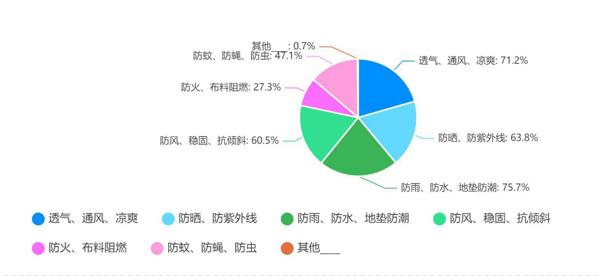 实用功能方面,关注度位列前三的分别是:防雨、防水、地垫防潮(75.7%),透气、通风、凉爽(71.2%),防晒、防紫外线(63.8%)。此外,防风、稳固、抗倾斜(60.5%),防蚊、防蝇、防虫(47.1%),和防火、阻燃功能(27.3%),也受到相当程度的关注。