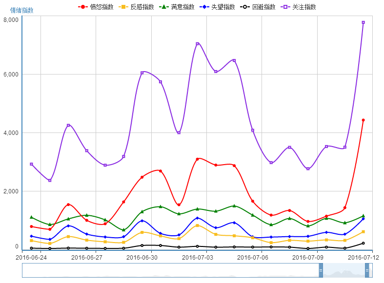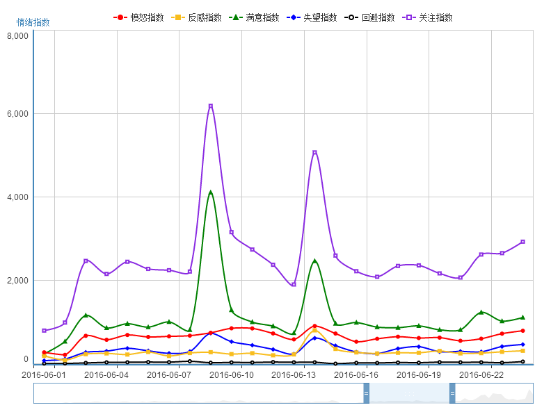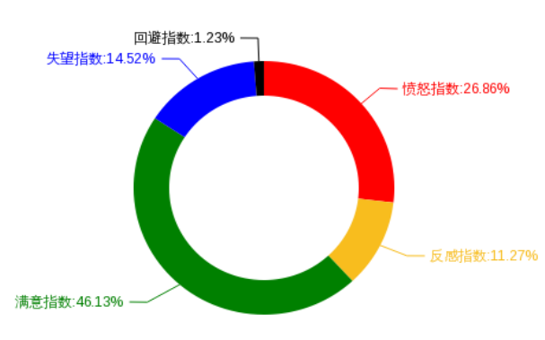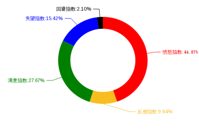 “中国网民消费情绪指数”大数据监测平台,是中国消费者报社与工信部电子科学技术情报研究所网络舆情中心联合开发的一个网民消费情绪实时监测、精准分析平台。该平台运用大数据技术,在对网民的意见、评价进行实时抓取、监测的基础上,进行了实时的量化分析。分析共分为六大指数,包括关注指数、满意指数、失望指数、回避指数、愤怒指数、反感指数,其中,关注指数为其他五个指数之和。