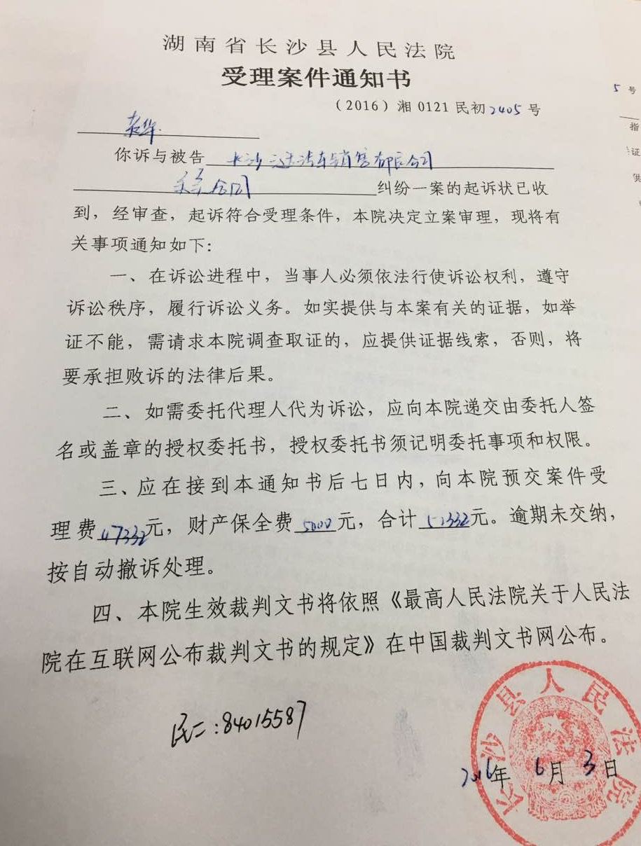 长沙县人民法院当场受理并立案。记者发稿时得知,苏华接到法院通知,本案将于7月4日开庭审理。