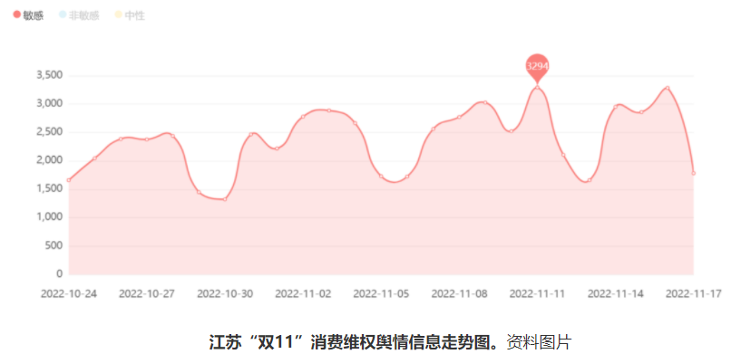 10月24日—11月17日,江苏省消保委系统共收到“双11”相关维权投诉310件,涉及到宣传、预售、价格、快递物流、产品质量等多方面。舆情方面共收集“双11”消费维权类信息58997条,占消费类信息总量的11.5%;监测期间,消费维权类信息呈曲线波动走势,11月11日信息量达到峰值,为3294条。