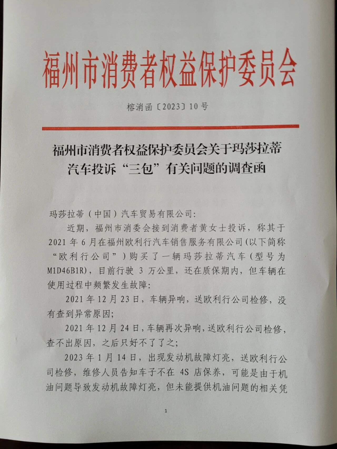 福州消委会发函给玛莎拉蒂总部。资料图片