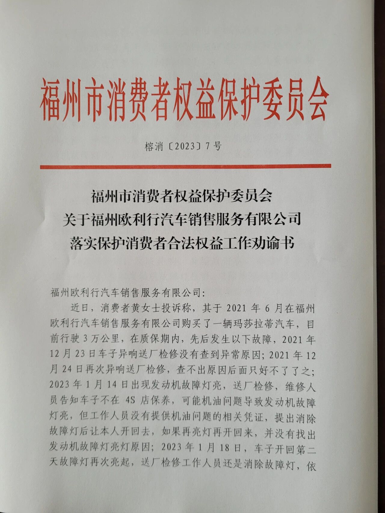 由于欧利行4S店一再以黄女士车辆未在4S店维保及要求提供维保单位资质等为由推诿承担车辆“三包”责任,2023年3月28日,福州市消委会依据《消协组织消费维权约谈经营者办法(试行)》的有关规定,对欧利行4S店进行了约谈,并向其发出《落实保护消费者合法权益工作劝谕函》,指出其应当承担车辆更换或者退换的法律责任,不应以维护、保养不在4S店为由推诿“三包”责任;更不应以数次发动机故障灯维修未果后发生过机油灯报警,怀疑因机油缺失或者发动机机油压力不足导致发动机内部机械磨损报警,进而推断维护、保养不合规范;甚至还以生产厂家要求提供维修厂的维修资质证明、修理机构营业执照、电子维修清单或者发票、配件采购进货渠道证明等为由,推诿应由销售者依法承担的“三包”责任。