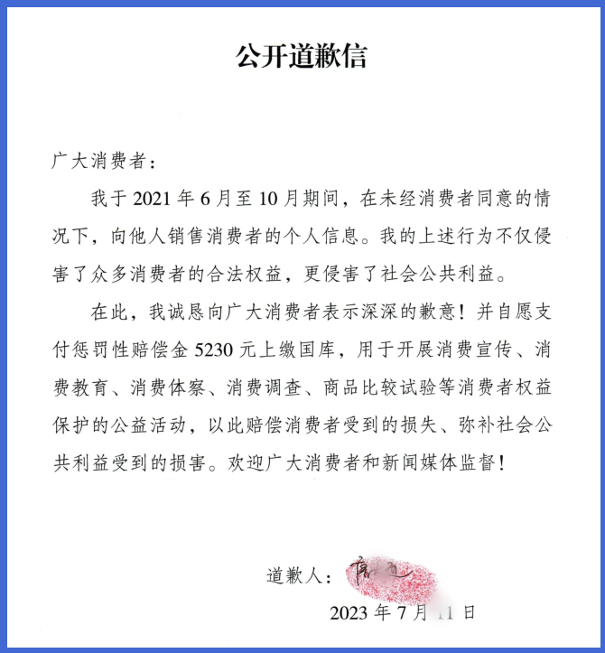 重庆市铜梁区六三装饰工程有限公司员工赵某、刘某波为牟取非法利益,在未经消费者同意的情况下,购买铜梁区多个小区消费者个人信息数千条,并对外出售。重庆市消委会认为这两个人的行为损害了众多不特定消费者的合法权益,危害社会公共利益,向重庆市第一中级人民法院提起公益诉讼。近日,在庭前调解中,两名被告均认识到自身过错,与重庆市消委会达成调解协议:在《中国消费者报》上刊登公开道歉信,并在两年内参加4次消费领域公益活动。