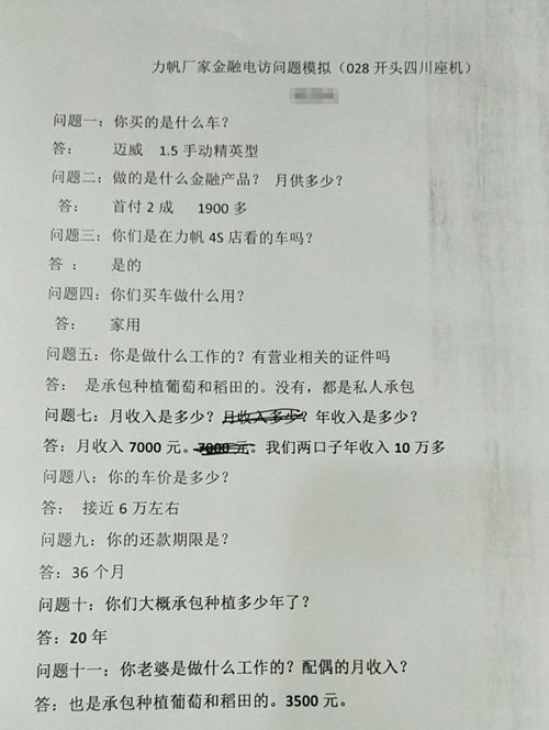 记者采访还了解到,当初购车时,4S店还为每位车主“量身定做”了一份金融公司电话访问模拟话术,包括购买车型、车价(比实际购买价高)、职业、金融产品类别、经济收入等,并将问题和答案写在一张纸上交给车主,要求车主熟记。