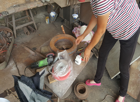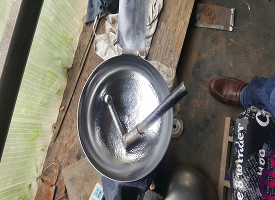 7月15日下午,几经周折,记者终于在章丘区普集街道苏家村村南找到了章丘铁锅一号店的生产厂家。摸索走进生产区后,记者见到一位工人正在打磨锅,其他工位上的工人还没上班。记者与这位工人打招呼,得知他就是网店宣传图片中手举铁锅的师傅。在现场,记者还看到,在几个敲锅的砧子上放着未打制完的半成品,均是锅的形状。师傅用一个圆头锤子敲锤花,从锅底慢慢敲打到锅边。“锅边一般都不敲,因为容易裂口子。”师傅说道。在整个厂区,除了打锤花的圆锤,记者并没有看到《舌尖上的中国》(第三季)报道的锻打过程中需要的十几种不同规格的锤子。