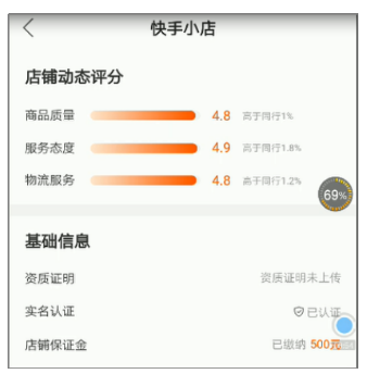 快手直播平台的“燕姐品牌护肤”和“长春小月彩妆达人”两家店铺,虽然已实名认证和缴纳店铺保证金,但均未上传资质证明。