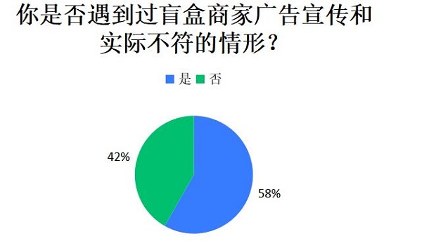 此次调查共获得有效答卷158份,调查结果显示,89%的消费者购买过盲盒;58%的消费者遇到过盲盒经营者广告宣传和实际不符的情况;31%的消费者购买了20个以上盲盒才抽到心仪的款式。消费者在盲盒消费过程中遇到的主要问题是虚假宣传、过度营销、产品质量和售后服务。