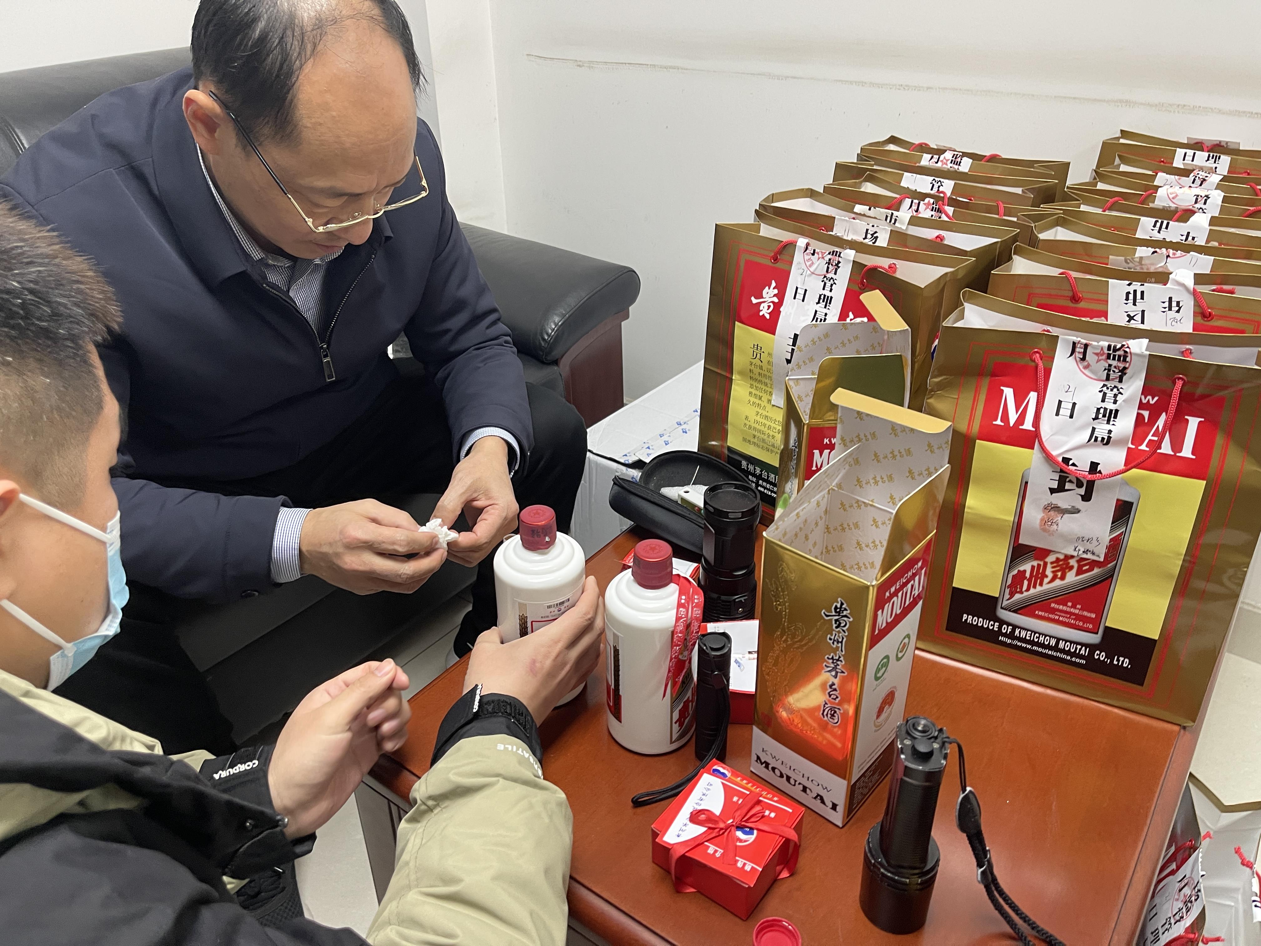 李家沱街道市场监管所依法将25瓶茅台酒进行了扣押,并联系贵州茅台酒股份有限公司进行鉴定。技术人员鉴定时,先核验了商标、防伪码、瓶盖等处,没有发现异样,再用强光手电筒照射瓶身,很快发现下方有一个针眼大小的黑点,随后对另外24瓶酒逐一照射,发现每瓶酒在相同位置都有一个类似的黑点,再用专业设备鉴别,确定这25瓶茅台酒都是以假乱真、以次充好的“打孔”酒,最终出具的鉴定结论为“通过外观辨认(鉴定),送辨样品与我公司出厂产品外包装特征不符,非我公司生产,属假冒注册商标的产品,属于揭正标打孔酒”。
