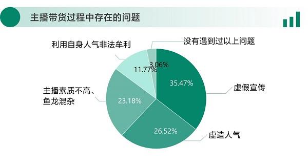 有55.23%的消费者认为直播电商平台的主要问题是存在虚假交易等问题;49.24%的消费者认为直播电商平台的主要问题是存在虚假弹幕、刷好评等行为。而主播带货的虚假宣传、虚造人气等问题较为突出。35.47%的消费者认为主播带货过程中的主要问题是存在虚假宣传;26.52%认为存在虚造人气的问题;23.18%的消费者认为主播素质不高、整体上鱼龙混杂;11.77%的消费者认为某些主播会利用自身人气非法牟利。综合来看,虚假宣传泛滥和售后服务困难是消费者没有选择网络直播购物的主要原因.