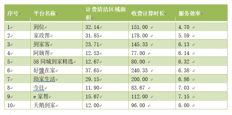 此外,本次评测的服务效率指根据实际清洁区域面积与计费服务时长相比,得出每平方米的工作时间。计算结果显示,到位APP每服务一平方米的玻璃需要4.7分钟,服务效率位居第1名。服务效率汇总表如下: