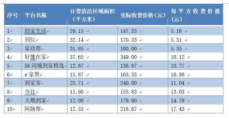 本次服务评测实际消费情况显示,各平台“擦玻璃”服务平均收费价格为10.39元/平方米,其中收费相对较低,基本在每平方米在5-10元之间,为到位、家政帮、助家生活;58同城到家精选、e家帮、到家客、好慷在家、今往和天鹅到家6家平台收费在每平方米10-15元。实际收费情况汇总如下: