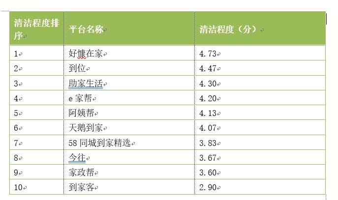 在清洁程度上,本次服务测评通过组织的10位消费者代表对30户住宅窗户的清洗前和清洗后视频及照片,完成清洁效果等综合打分并取平均值。评分结果显示,好慷在家、到位、助家生活、e家帮、阿姨帮、天鹅到家6家平台清洁质量较高。