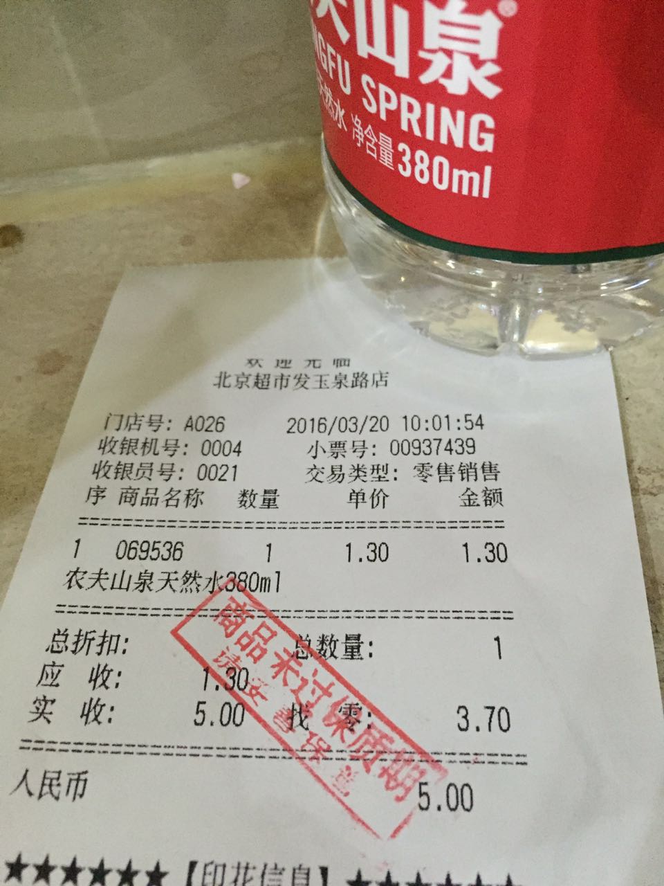 在超市发玉泉路店,记者发现,货架上贴有“温馨提示”,内容是“我店员工已认真检查了商品保质期,为确保您购物放心,请您也仔细查验日期,结账后收银员会在购物小票上加盖‘商品未过保质期’印章。感谢您的支持与配合”。记者在超市买了一瓶矿泉水,收银员在购物小票上加盖了“商品未过保质期”印章。记者按照小票上的提示拨打客服电话咨询。工作人员告诉记者,盖章是为了防止恶意投诉,“盖章是公司要求,证明我们出售的商品未过保质期”。