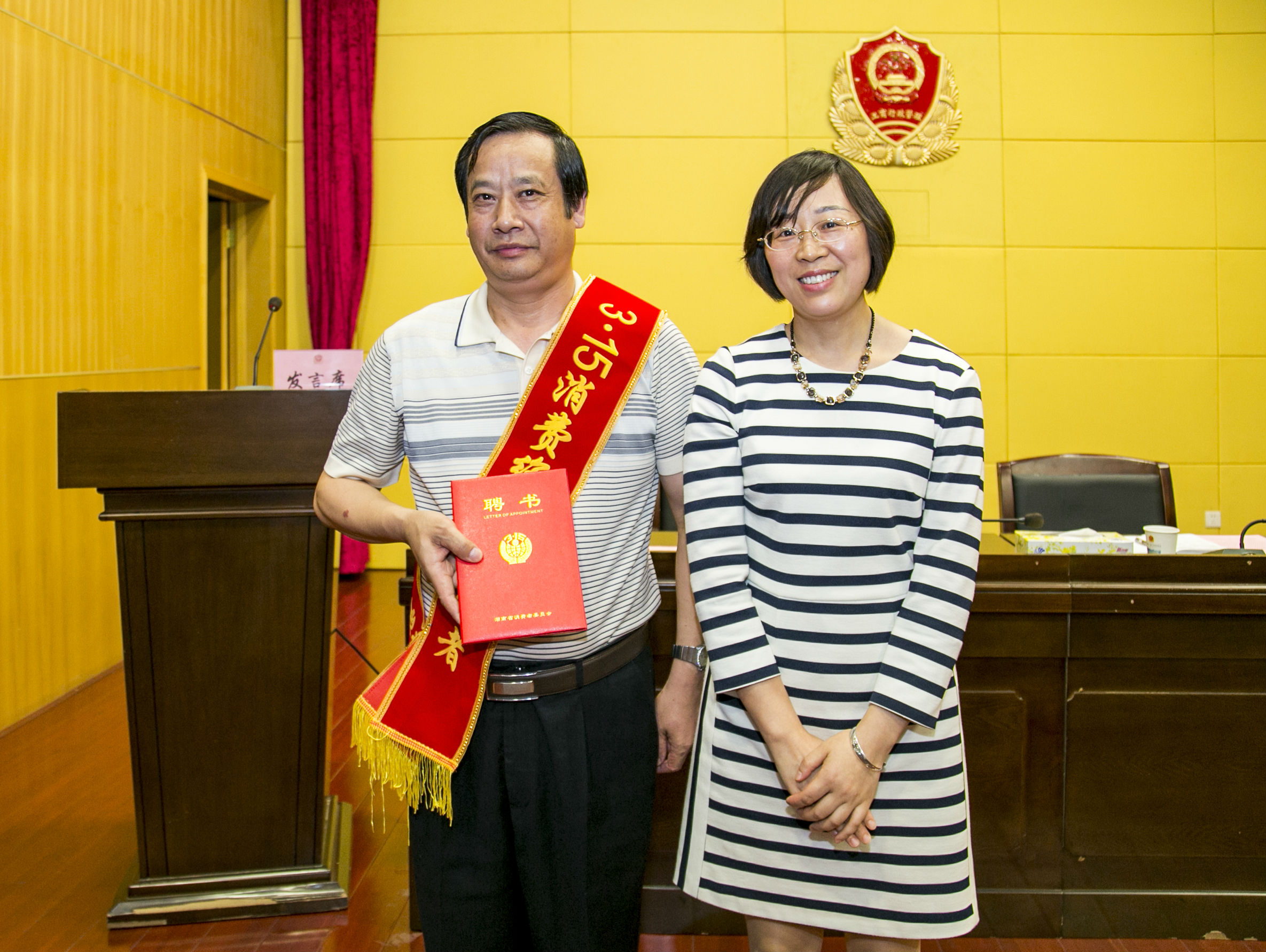 廖运国(左)被湖南省消委会聘为湖南省3·15消费维权志愿者,湖南省消委会负责人吴卫(右)为其颁发聘书。余知都摄