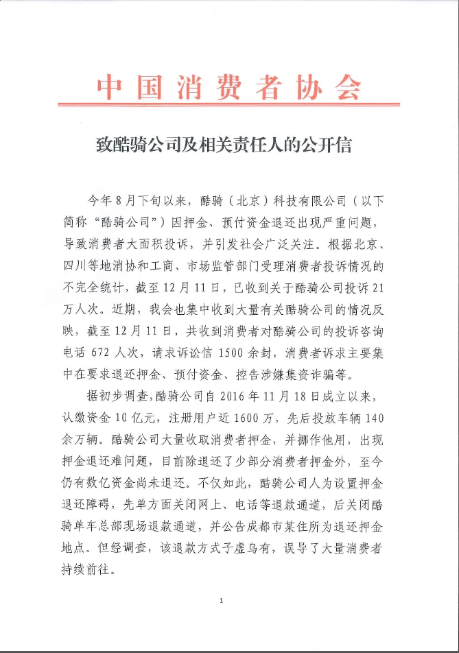 今年8月下旬以来,酷骑(北京)科技有限公司(以下简称“酷骑公司”)因押金、预付资金退还出现严重问题,导致消费者大面积投诉,并引发社会广泛关注。根据北京、四川等地消协和工商、市场监管部门受理消费者投诉情况的不完全统计,截至12月11日,已收到关于酷骑公司投诉21万人次。近期,我会也集中收到大量有关酷骑公司的情况反映,截至12月11日,共收到消费者对酷骑公司的投诉咨询电话672人次,请求诉讼信1500余封,消费者诉求主要集中在要求退还押金、预付资金、控告涉嫌集资诈骗等。