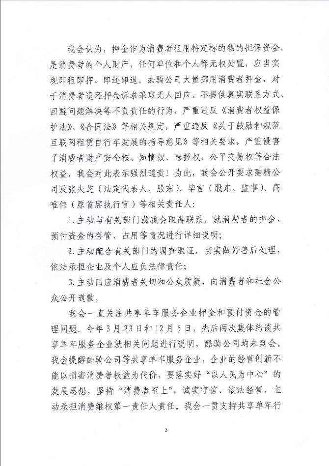 我会认为,押金作为消费者租用特定标的物的担保资金,是消费者的个人财产,任何单位和个人都无权处置,应当实现即租即押、即还即退。酷骑公司大量挪用消费者押金,对于消费者退还押金诉求采取无人回应、不提供真实联系方式、回避问题解决等不负责任的行为,严重违反《消费者权益保护法》、《合同法》等相关规定,严重违反《关于鼓励和规范互联网租赁自行车发展的指导意见》等相关要求,严重侵害了消费者财产安全权、知情权、选择权、公平交易权等合法权益,我会对此表示强烈谴责!为此,我会公开要求酷骑公司及张夫芝(法定代表人、股东)、毕言(股东、监事)、高唯伟(原首席执行官)等相关责任人: