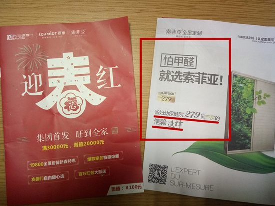 记者走访时还发现,多家索菲亚门店内都张贴着一则宣传海报——“以爱之名,定制健康,江苏省妇幼保健院的选择,索菲亚进驻249间产房”。店内销售人员以此宣传佐证“索菲亚产品环保性能在行业内是标杆”。记者在部分门店内拿到的“迎春红”活动宣传册上却看到,“怕甲醛,就选索菲亚!省妇幼保健院279间产房的信赖选择”,其中数字“279”字体被放大加粗,“产房”字样特别标注为绿色。