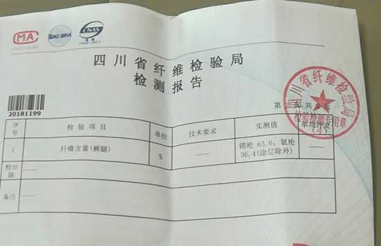 曹女士所购塑身衣的送检结果如何呢?“检测后发现,完全是挂羊头卖狗肉。”曹女士说,今年3月7日,她将购买的塑身衣送到四川省纤维检验局进行了检测,检验结果为“裤腿的纤维含量锦纶63.6%,氨纶36.4%(涂层除外)”。