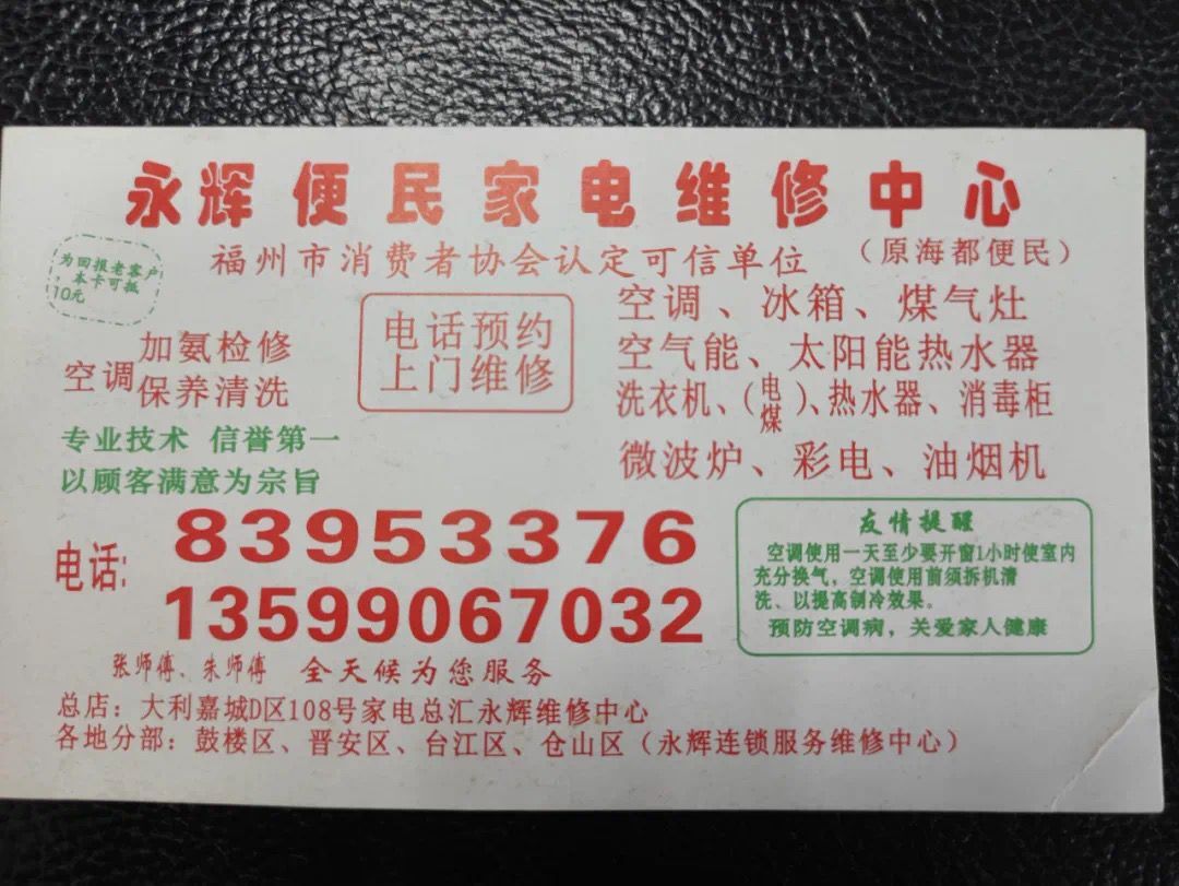 记者调查还发现,不止上述一家维修中心假冒消协诚信单位,还有一家“永辉便民家电维修中心”所发的小卡片上也写着“福州市消费者协会认定可信单位”,根本就是自我标榜,纯属虚假宣传。