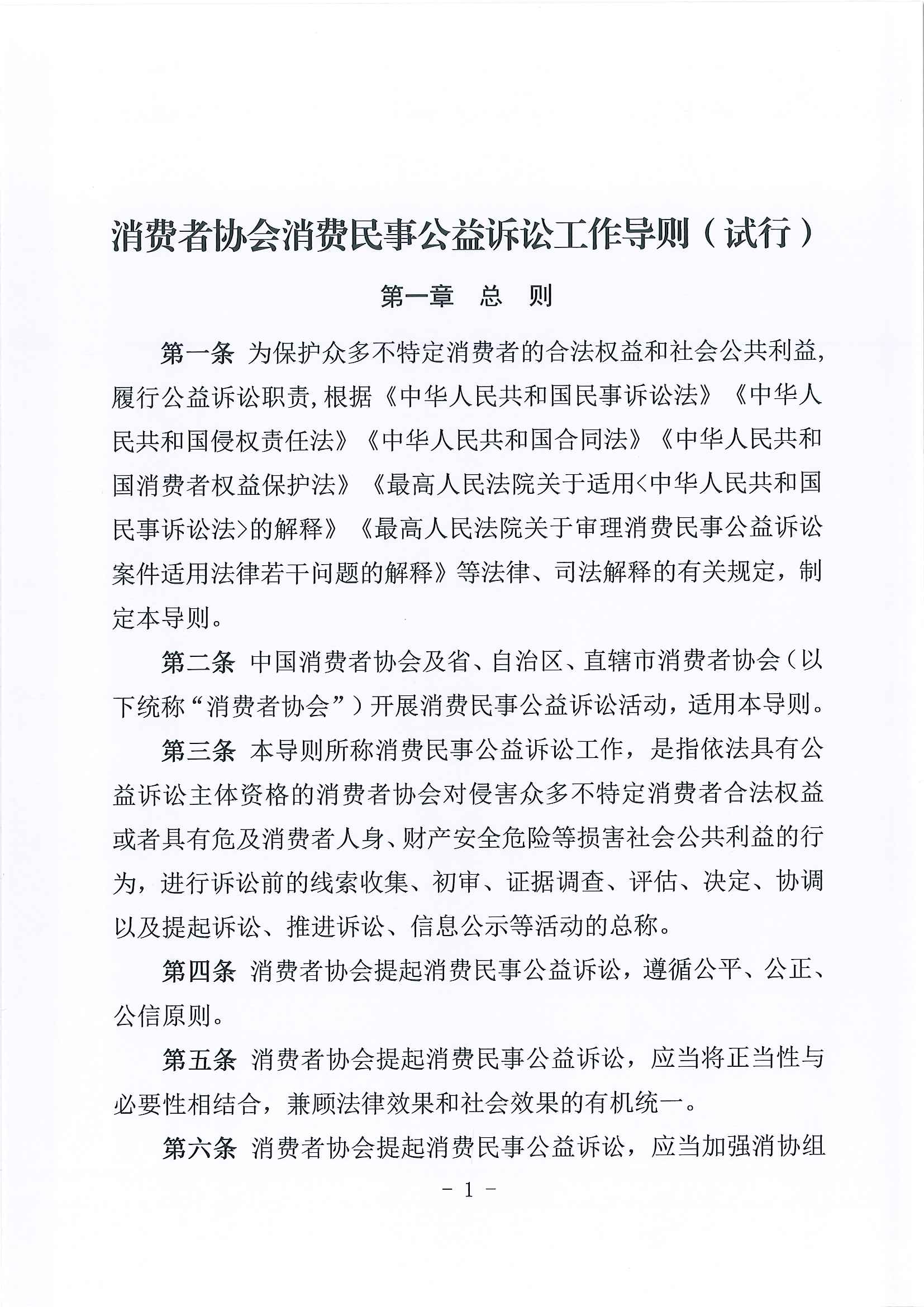 中国消费者协会关于印发《消费者协会消费民事公益诉讼工作导则(试行)》的通知 | | 发布时间:2020-05-06 00:00:00 扫一扫在手机打开当前页 【打印正文】 【复制链接】 分享让更多人看到 推荐文章