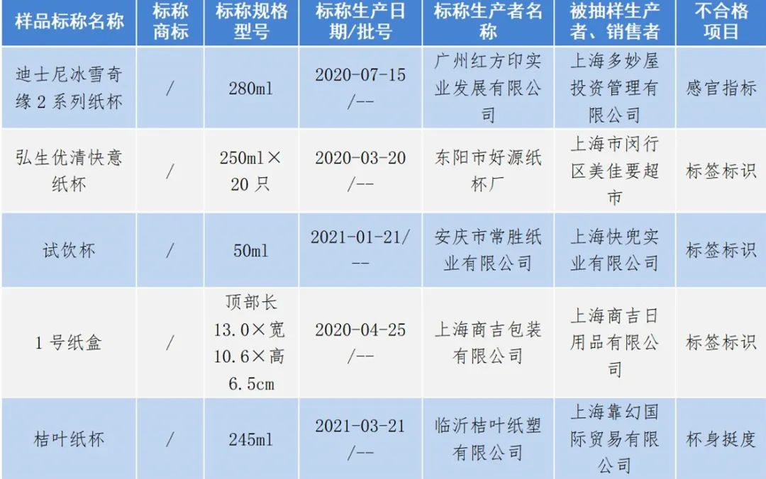 近日,上海市市场监管部门对一次性塑料餐饮具和一次性纸餐饮具开展产品质量监督抽查,共涉及一次性塑料餐饮具60批次,一次性纸餐饮具55批次。其中,8批次一次性塑料餐饮具、5批次一次性纸餐饮具不合格。涉及标称名称为“新生优清航空塑胶杯””迪士尼冰雪奇缘2系列纸杯”等产品。