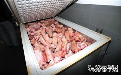 朝阳奶西村加工作坊冰柜内码放的未加工猪蹄,其与左侧被“泡制”过的猪蹄相比,布满血色,颜色发黄“没卖相”。