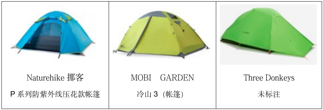 4款样品防紫外线性能略逊,获得3颗星。如在上海三夫户外用品有限公司邯郸路店购买的冷山3(帐篷),标称商标为MOBI GARDEN,标称规格型号/货号为(50+180+50)×210×120(H)CM款号为NXZQU61008,价格为618元。