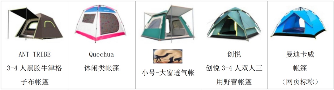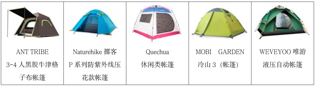 有4款样品综合评分较高,分别为在上海珑圣畅商贸有限公司(京东,能量狐户外旗舰店)购买的3-4人黑胶牛津格子布帐篷,标称商标为ANT TRIBE,标称尺寸为218*218*150cm(长*宽*高),价格为539元;在上海雪鹰贸易有限公司(京东,雪鹰运动户外专营店)购买的P系列防紫外线压花款帐篷,标称商标为Naturehike挪客,标称规格型号为长205×宽(45+160+40)×高110cm,货号为NH18Z033—P,价格为398元;在迪卡侬(上海)体育用品有限公司五角场分公司购买的休闲类帐篷,标称商标为Quechua,标称规格型号/货号为CC:308291,价格为399.9元,以及在上海禄鑫电子商务有限公司(京东,禄鑫户外专营店)购买的小号—大窗透气帐,标称尺寸为210*210*140CM,型号为CS—8762,价格为248元。