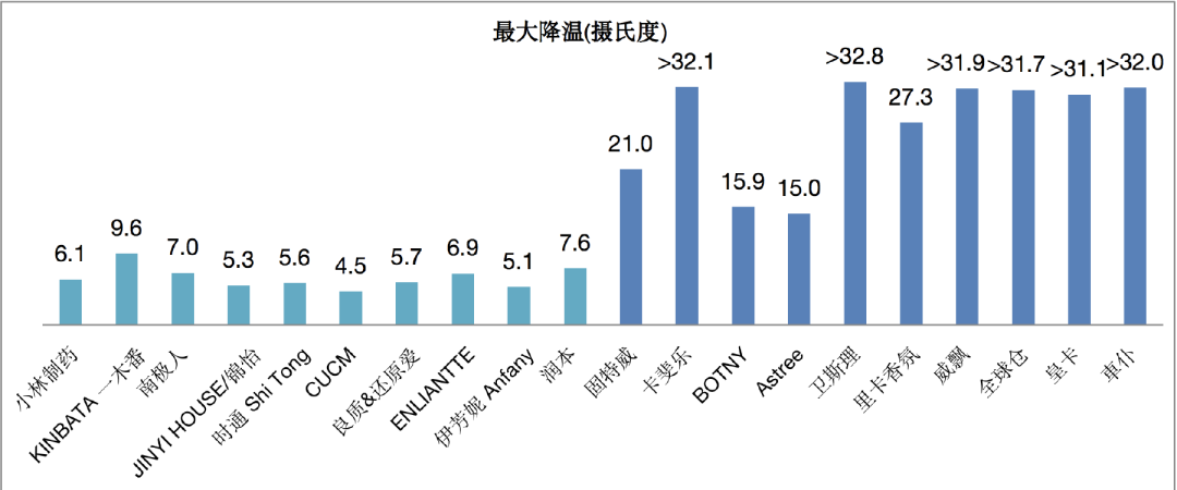 测试发现,常压类降温喷雾的降温效果在4—10℃之间;加压类降温喷雾的降温效果均在15℃以上,相较于常压类样品降温性能更强。而在10件加压类降温喷雾样品中,有6件样品的降温效果超过了30℃,测试温度均降低至0℃以下。