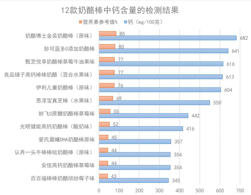 据上海市消保委介绍,以100克计,有5款样品的钙含量实测值超过600mg,3款在400mg—600mg,4款在300mg—400mg。12款奶酪棒样品的钙含量约为鲜牛奶的3.3—6.6倍,其中奶酪博士、妙可蓝多2款样品的钙含量较高。
