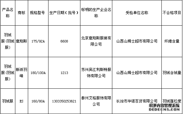 30日,山西省质量技术监督局在其官网通报羽绒服产品质量监督抽查结果,不合格产品检出率为10%。 本次共对太原、长治地区市场上经销的由省外企业生产的50个批次的羽绒服质量进行了监督抽查,合格45个批次。山西山姆士超市有限公司经销的标明北京意翔斯服装有限公司生产的175/92A型“意翔斯”羽绒服(羽绒服),其纤维含量不符合标准要求。山西山姆士超市有限公司经销的标明苏州吴江利斯特服饰有限公司生产的180/100A型“新派羽峰”羽绒服(羽绒服),其羽绒含绒量不符合标准要求。长治市华诺百货有限公司经销的标明泰州艾格服饰有限公司生产的160/80A型“ES”羽绒服,其羽绒蓬松度不符合标准要求。山西万马仕商贸城有限公司经销的标明上海知恩服饰有限公司生产的155/80A型“GCCG”短款羽绒服(羽绒服),其羽绒清洁度不符合标准要求。太原市乔丹滨河店经销的标明乔丹体育股份有限公司生产的155/80A型“乔丹”梭织羽绒服,其羽绒清洁度、羽绒蓬松度不符合标准要求。 针对本次产品质量省监督抽查反映的问题,山西省质量技术监督局要求各级质监部门严格按照有关法律、法规,本着“扶优扶强、打假治劣、引导消费”的原则,认真做好产品质量省监督抽查后处理工作。 山西省消费品质量监督抽查不合格产品及生产经销企业名单
