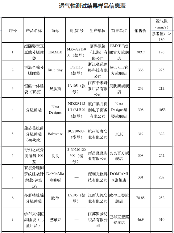 16批次产品透气性指标在180mm/s至500mm/s之间,占总样品数的64%,包括little tiny恒温全棉分腿睡袋、贝肽斯恒温一体睡袋(双层)、Babycare蒲公英抗菌分腿睡袋(初秋款)、良良奇幻之旅分腿睡袋100蓝等。呼西贝网眼分腿睡袋、爱蓓优JZ202888春秋空气层睡袋、milkbarn夹棉长袖长裤睡袋3批次产品的透气性指标在501mm/s至1000mm/s之间,占总样品数的12%。Nest Designs分腿睡袋、威尔贝鲁(wellber)前六后四纱布长袖儿童分腿睡袋、婴童树初夏物语分腿睡袋、英贝蒂儿水彩花朵睡袋等4批次产品的透气性指标大于1000mm/s,占总样品数的16%。