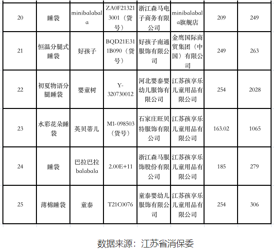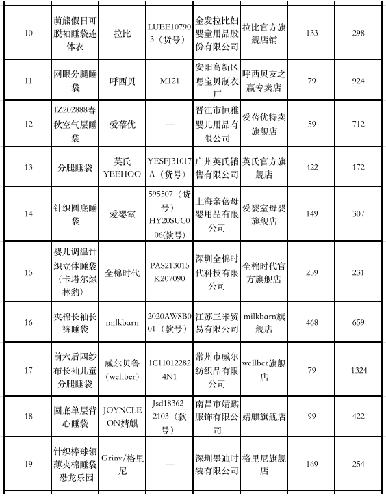 本次比较试验的样品分别从电商平台和线下实体店购买,其中从电商平台购买了20批次,在实体店商场购买了5批次。从产品款式上看,涉及分腿式睡袋12款、一体式睡袋13款。本次购买的婴幼儿睡袋单价从46.9元/套至468元/套不等。产品品牌覆盖好孩子、巴拉巴拉balabala、巴布豆、爱婴室、全棉时代等市场主流品牌。