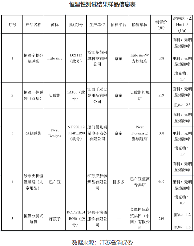 天气转凉,婴幼儿睡袋销售火热。不少商家以恒温、快速吸汗等为宣传卖点,吸引了大批宝爸宝妈。这些睡袋的价格从几十元到几百元不等。它们的质量究竟怎样呢?11月10日,江苏省消费者权益保护委员会发布婴幼儿睡袋比较试验分析报告。结果显示,little tiny、贝肽斯、Nest Designs、巴布豆4款恒温睡袋调温效果较为一般。