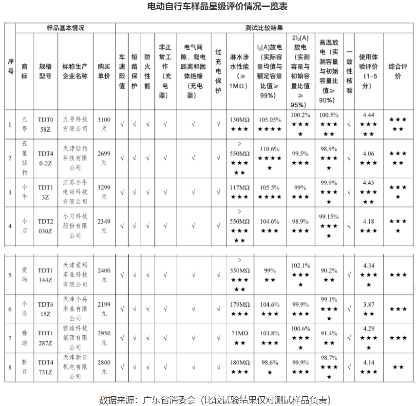 11月24日,记者获悉,近期,广东省消委会联合东莞市消委会组织开展了电动自行车商品比较试验,对20款主流品牌和型号的电动自行车整车(含随车的电池、充电器,电池均为锂离子电池)进行测试。结果显示,仅8款获评星级以上。