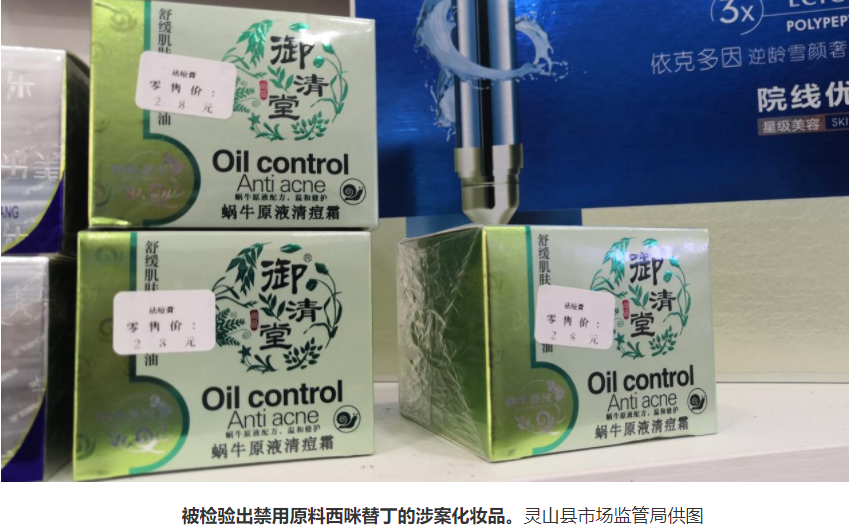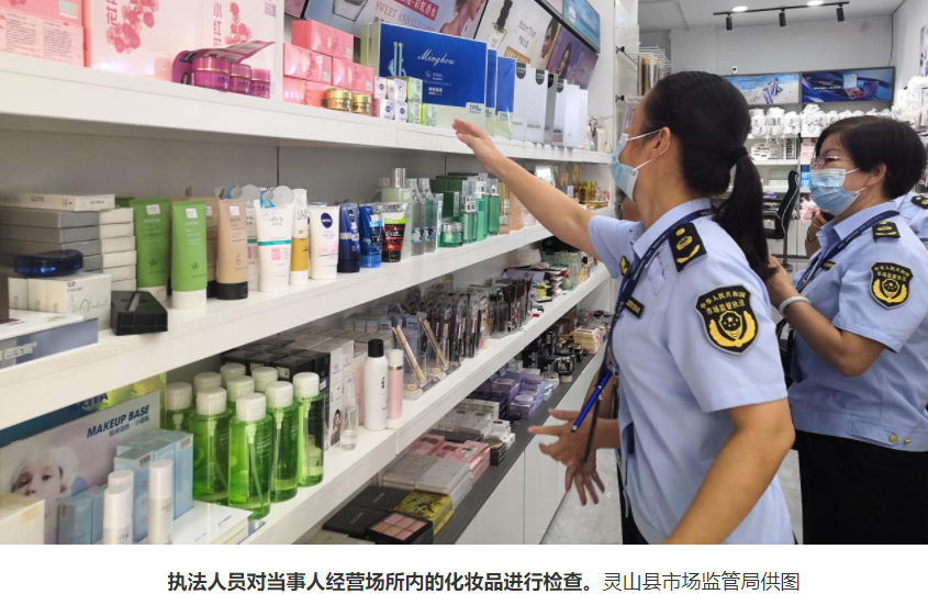 近日,广西壮族自治区灵山县艺变美日用化妆品店因销售违法添加西咪替丁、无中文标签的化妆品,被灵山县市场监管局给予罚没款14695元、没收涉案化妆品的行政处罚并移送公安机关。