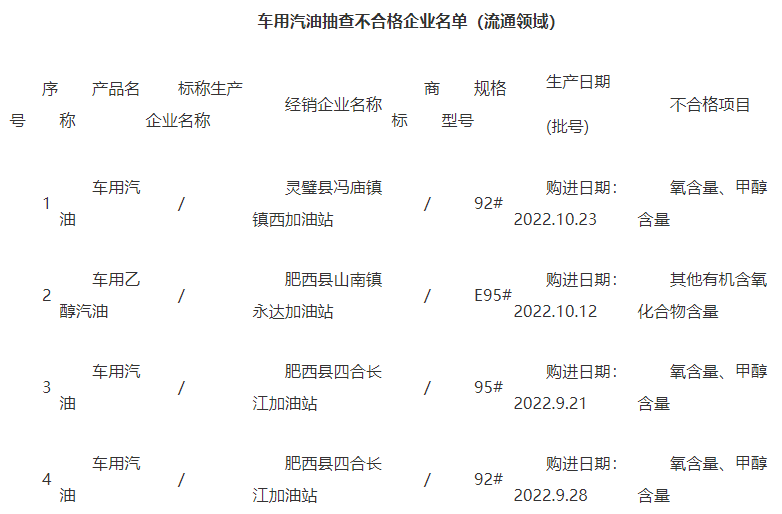 本次抽查的车用汽油共在安徽省内10个地市抽取了500组样品,均在流通领域抽查。其中,合肥市抽查了304组、淮南市抽查了41组、淮北市抽查了1组、池州市抽查了2组、滁州市抽查了23组、阜阳市抽查了19组、铜陵市抽查了26组、宣城市抽查了55组、安庆市抽查了4组、宿州市抽查了25组。经检验,合格496组,合格率为99.2%;不合格4组,不合格率为0.8%。